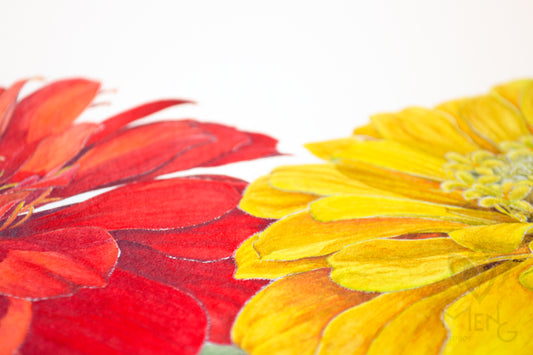 Two zinnias are blooming under the scorching summer sun. Red and yellow, light and shadow form a mutual contrast. Against the backdrop of green leaves, they are also incomparably harmonious. In addition, the velvet texture of petals and the plush pistils are also vividly depicted.